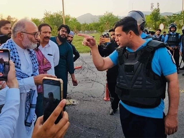 The demonstration, like many in the capital, was met with a heavy police presence. As the crowd moved towards the city's Red Zone, it was stopped by a cordon of law enforcement officials. Amid the stand-off, a police officer turned to Mushtaq Ahmed and, in a mocking tone, remarked: